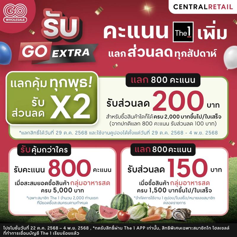 - สะสมยอดซื้อสินค้ากลุ่มอาหารสด ครบ 5,000 บาท ที่โก โฮลเซลล์ ทุกสาขา หรือแอปพลิเคชัน โก โฮลเซลล์ จึงจะได้รับคะแนนพิเศษ 800 คะแนน