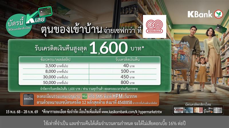 • ยอดใช้จ่ายที่ร่วมรายการ: สงวนสิทธิเฉพาะการใช้จ่ายแบบชำระเต็มจำนวนที่ Big C Supercenter, Big C Market, Mini Big C, Big C Foodplace, Big C Food Service รวมถึงเว็บไซต์ www.bigc.co.th, และแอปพลิเคชัน Big C PLUS, Go Wholesale, Lotus’s, Lotus’s Go Fresh รวมถึงเว็บไซต์ www.lotuss.com, และ แอปพลิเคชัน Lotus’s SMART วันที่ 15 พ.ย. 2568 – 28 ก.พ. 2569(“ร้านค้าที่ร่วมรายการ”) ภายในระยะเวลาส่งเสริมการขายเท่านั้น