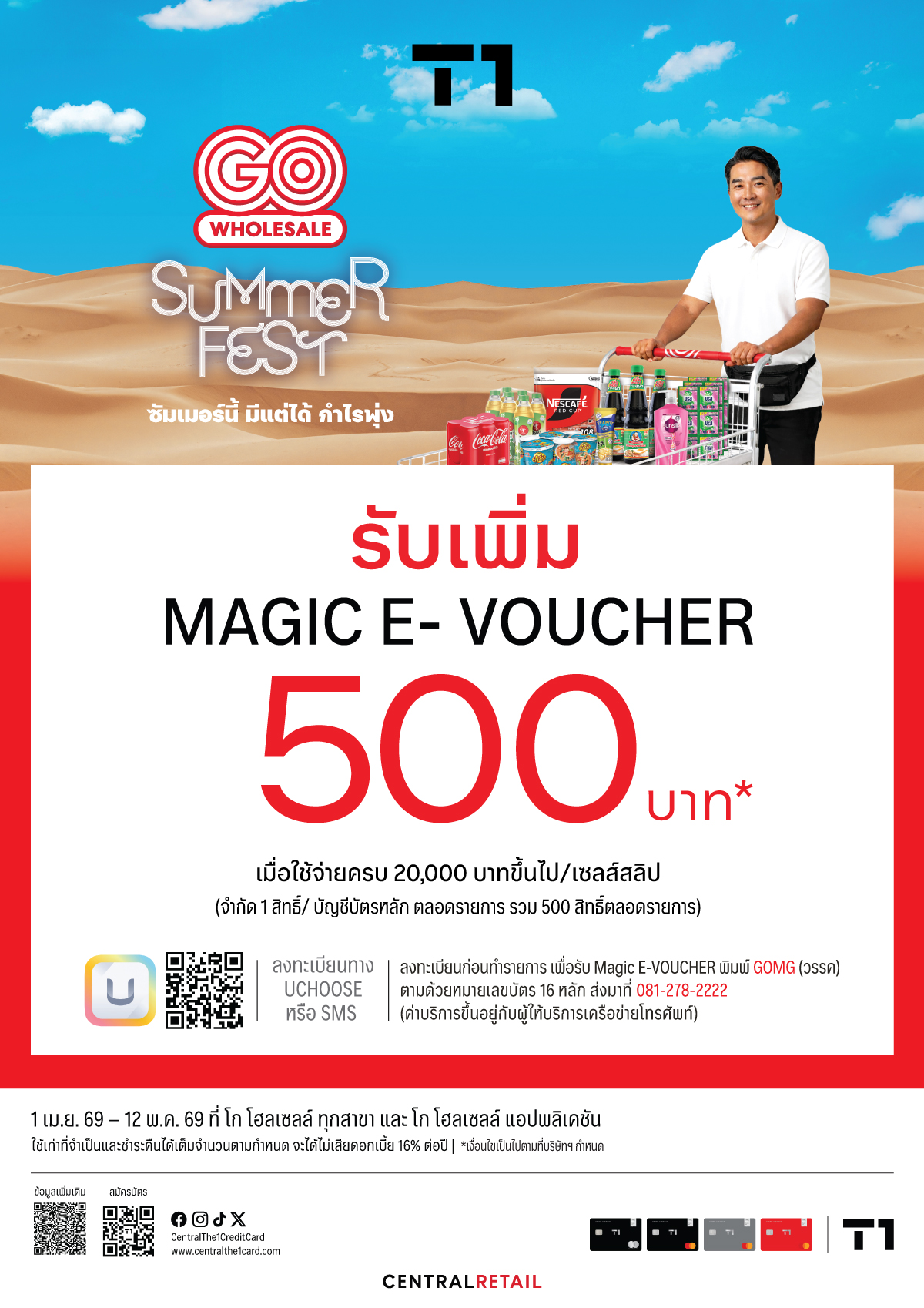 บริษัทฯ จะมอบ Magic e-gift card ให้แก่สมาชิกบัตรที่มียอดใช้จ่ายผ่านบัตรเครดิตเซ็นทรัล เดอะวัน ครบตามเงื่อนไขที่บริษัทฯ กำหนด ที่ โก โฮลเซลล์ ทุกสาขา และ โก โฮลเซลล์ ออนไลน์ ระหว่างวันที่ 1 เม.ย. 69 – 12 พ.ค. 69