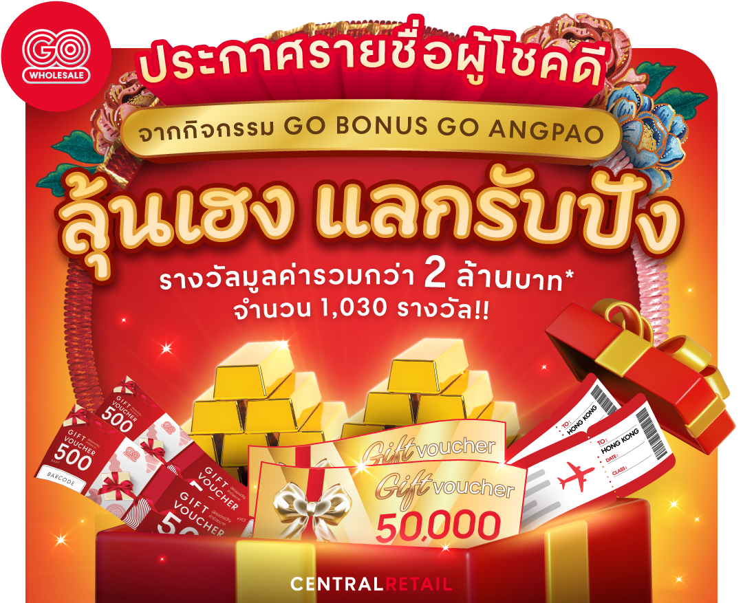 2. สมาชิกโก โฮลเซลล์ ที่ประสงค์จะเข้าร่วมกิจกรรมจับฉลากในแต่ละรอบต้องกดเข้าร่วมกิจกรรม [แคมเปญ GO BONUS GO ANGPAO ลุ้นเฮง แลกรับปังลุ้นโชคมูลค่ารวมกว่า 2 ล้านบาท] ผ่านแอปพลิเคชัน โก โฮลเซลล์ ระหว่างวันที่ 21 ม.ค. 2569 – 17 ก.พ. 2569