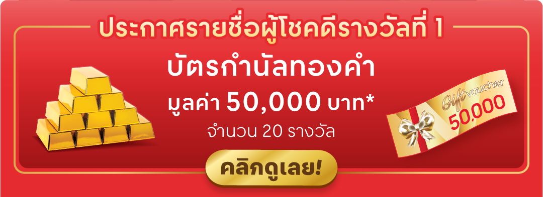 รางวัลที่ 1 บัตรกำนัลทองคำ มูลค่า 50,000 บาท* จำนวน 20 รางวัล