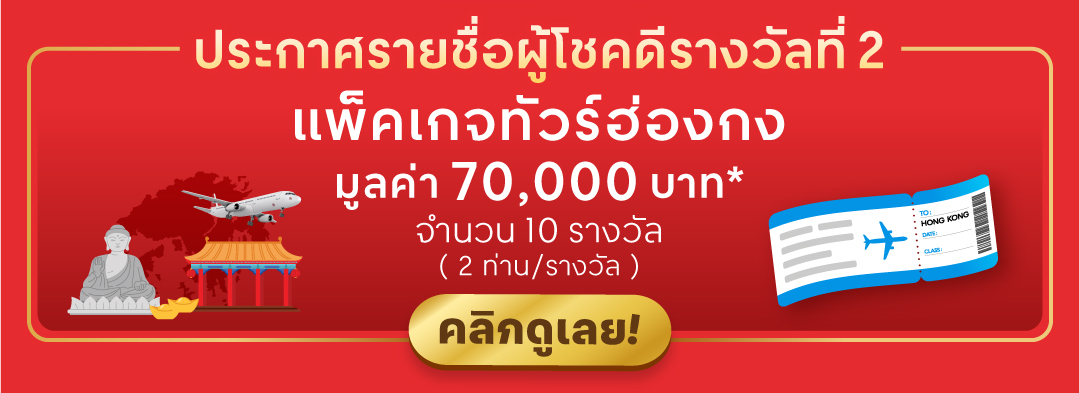 รางวัลที่ 2 แพ็คเกจทัวร์ฮ่องกง (2 ท่าน/รางวัล) มูลค่า 70,000 บาท* จำนวน 10 รางวัล
