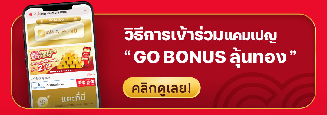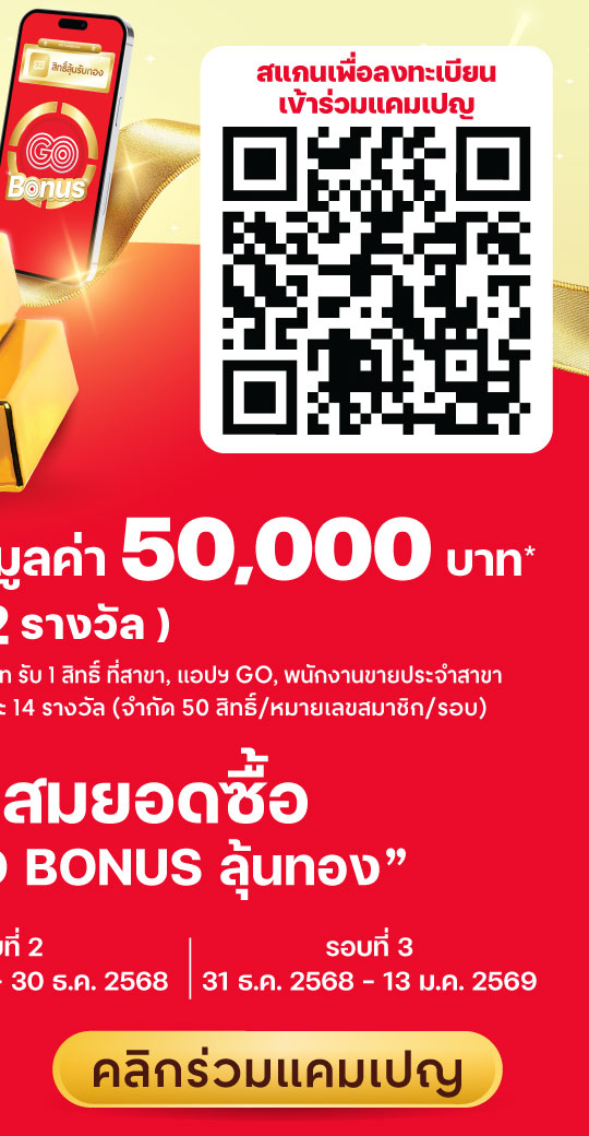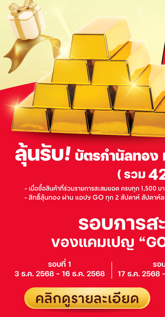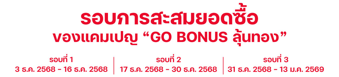 GO โบนัสลุ้นทอง สะสมยอดซื้อสินค้าใดก็ได้* ตามรอบระยะเวลาโปรมันครบทุกๆ 1,500 บาท