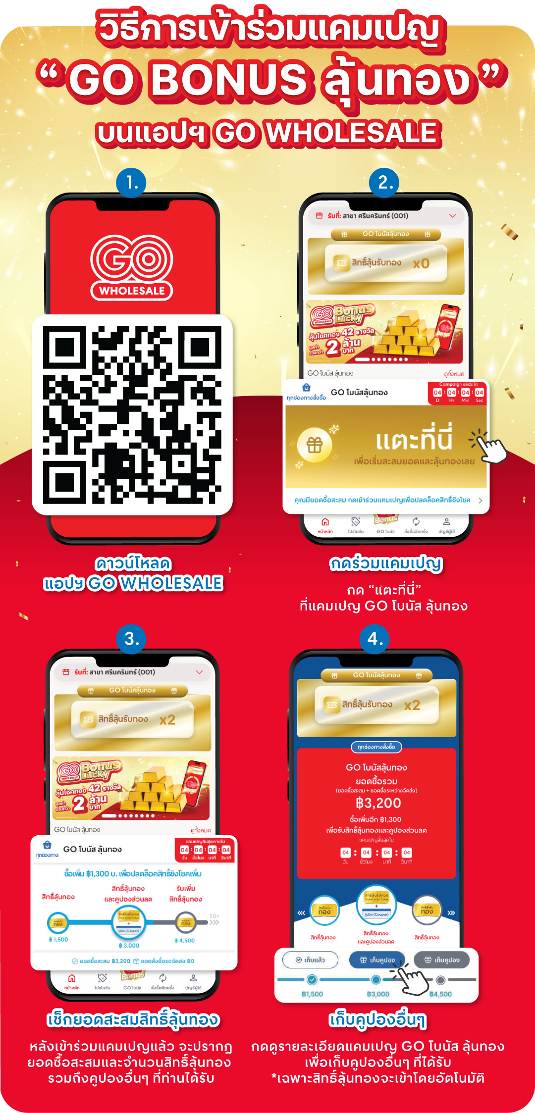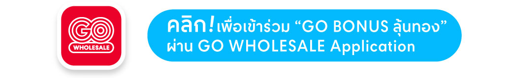 - สมาชิก โก โฮลเซลล์ ที่ประสงค์จะเข้าร่วมกิจกรรมในแต่ละรอบต้องกดเข้าร่วมกิจกรรม “GO โบนัส ลุ้นทอง” เพื่อลุ้นรับบัตรกำนัลทองมูลค่า 50,000 บาท รวมมูลค่ากว่า 2.1 ล้านบาท ผ่านแอปฯ GO WHOLESALE ตามรอบที่กำหนดดังนี้