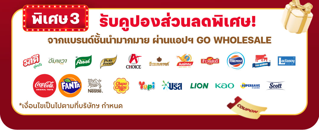 - ในกรณีที่ใช้คูปองเงินสดที่โก โฮเซลล์ทุกสาขา กรุณาแสดงคูปองเงินสดที่จุดบริการชำระเงิน โดยโก โฮลเซลล์ ขอสงวนสิทธิ์ไม่ให้ใช้ส่วนลดจากคูปองที่ได้มาจากการจับภาพหน้าจอ หรือรูปภาพที่คัดลอกจากส่วนลดจริง หรือถ่ายสำเนาทุกกรณี