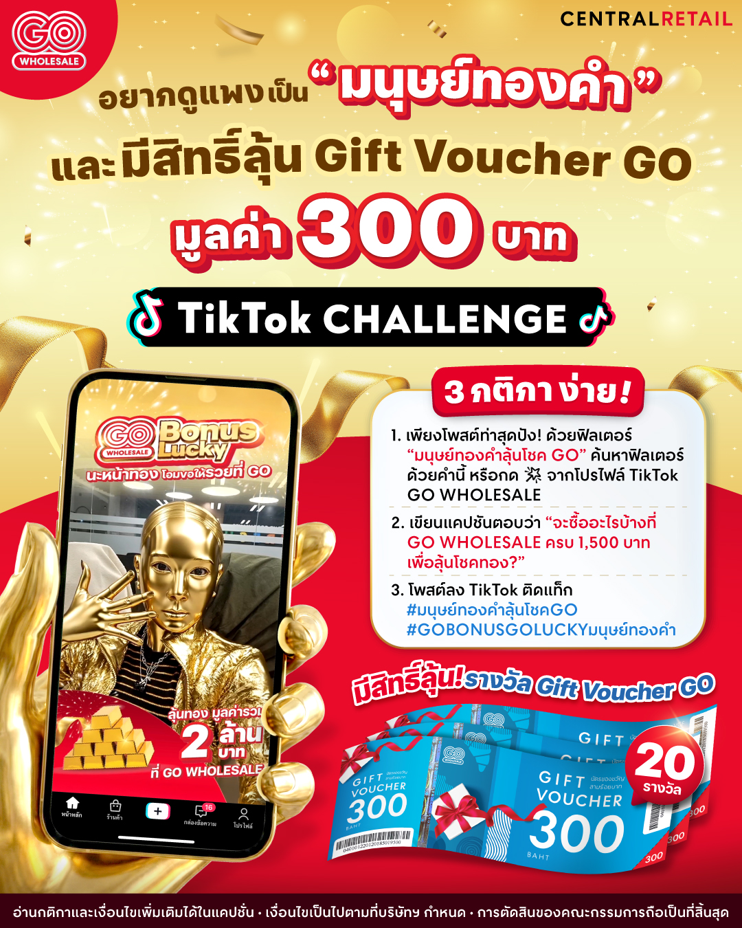 - โพสต์คลิปลงบัญชี TikTok ของตนเอง พร้อมติดแฮชแท็ก #มนุษย์ทองคำลุ้นโชคGO #GOBONUSGOLUCKYมนุษย์ทองคำ #GOWHOLESALE