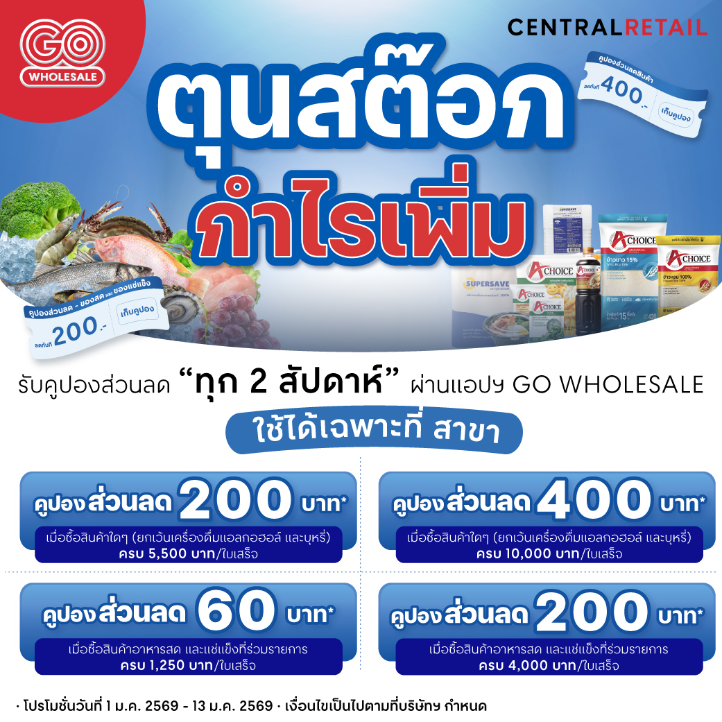 - สามารถกดเก็บคูปองผ่านแอปฯ โก โฮลเซลล์ และใช้ได้เฉพาะที่หน้าสาขาเท่านั้น ระหว่างวันที่ 1 ม.ค. 2569 – 13 ม.ค. 2569