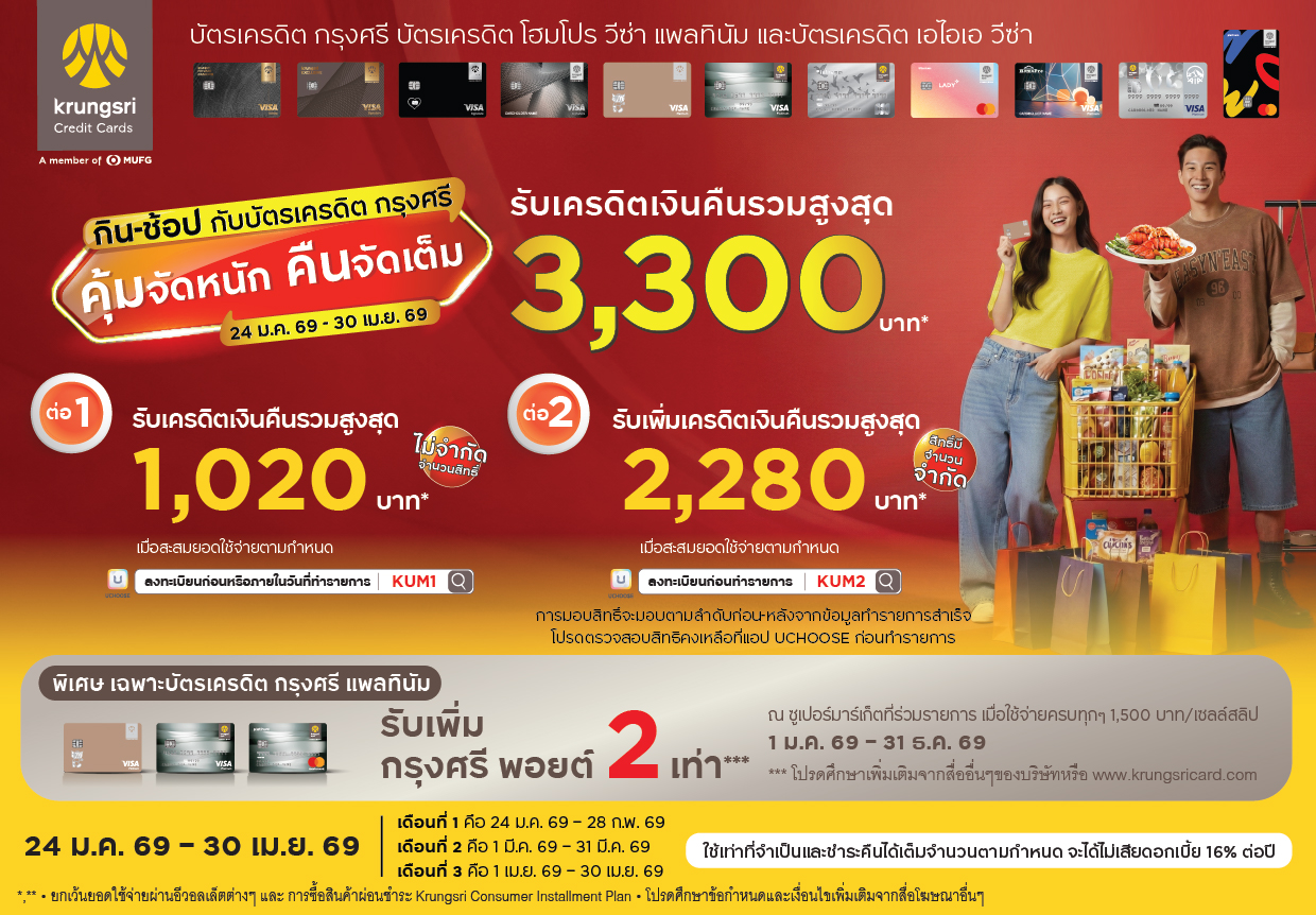• สงวนสิทธิ์การให้เครดิตเงินคืน สำหรับสมาชิกบัตรเครดิต กรุงศรี ทุกประเภท, บัตรเครดิต เอไอเอ วีซ่า, บัตรเครดิต โฮมโปร วีซ่า, บัตรเครดิต กรุงศรี เจซีบี แพลทินัม, บัตรเครดิต กรุงศรี นาว แพลทินัม  และบัตรเครดิต สยามทาคาชิมายะ (ยกเว้นบัตรที่ไม่ร่วมรายการ ได้แก่ บัตรเครดิต กรุงศรี คอร์ปอเรท การ์ด, บัตรเครดิต ทีซีซี พริวิเลจ การ์ด, บัตรเครดิต กรุงศรี โฮมโปร คอร์ปอเรท การ์ด) ที่ลงทะเบียนผ่านช่องทางแอป UCHOOSE ถูกต้องเพื่อรับสิทธิ์ และได้รับข้อความตอบกลับยืนยันการเข้าร่วมรายการ ก่อนทำรายการ เท่านั้น ลงทะเบียนเพียงครั้งเดียวรับสิทธิ์ตลอดรายการ เมื่อมียอดใช้จ่ายผ่านบัตรเครดิต กรุงศรีที่ร่วมรายการ ผ่านหมวด/ร้านค้าที่ร่วมรายการแบบชำระเต็มจำนวน ในระบบของ Visa, Master Card และ JCB