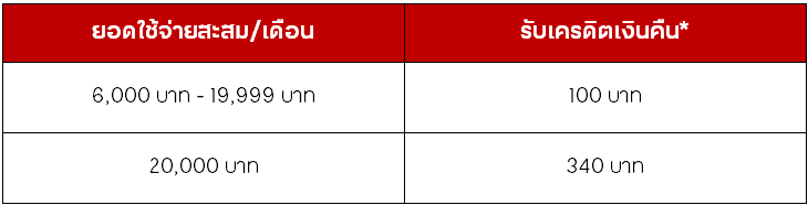 • *จำกัดรับเครดิตเงินคืนสูงสุด 340 บาท ต่อหมายเลขบัญชีบัตรหลักต่อเดือน โดยเครดิตเงินคืนจะถูกโอนเข้าบัญชีบัตรหลักภายใน 7 วันหลังจบเดือนในแต่ละเดือน (คำนวณยอดใช้จ่ายจากทั้งบัตรหลักและบัตรเสริมรวมกัน) โดยยอดใช้จ่ายแต่ละรายการสามารถนำมาสะสมหรือรวมกันได้ โดยจะคำนวณเครดิตเงินคืนจากยอดใช้จ่ายสะสมครบ 6,000.00 – 19,999.99 บาทต่อเดือน รับเครดิตเงินคืน 100 บาท,ยอดใช้จ่ายสะสมครบ 20,000.00 บาทขึ้นไปต่อเดือน รับเครดิตเงินคืน 340 บาท