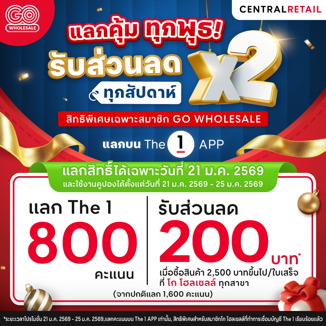 แลกคุ้ม ทุกพุธ! แลกคะแนน The 1 รับส่วนลด 200 บาท สำหรับซื้อสินค้า 2,500 บาทขึ้นไป/ใบเสร็จ (โปรโมชั่นวันที่ 21 ม.ค. 2569 – 25 ม.ค. 2569)